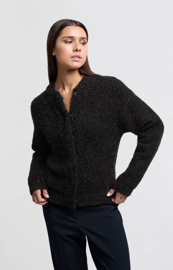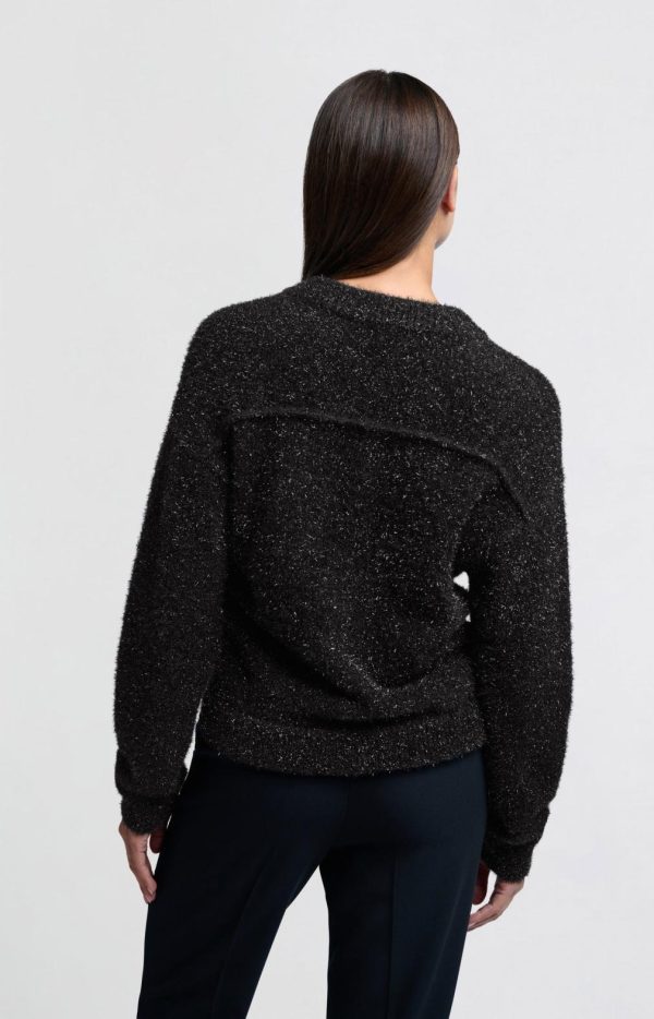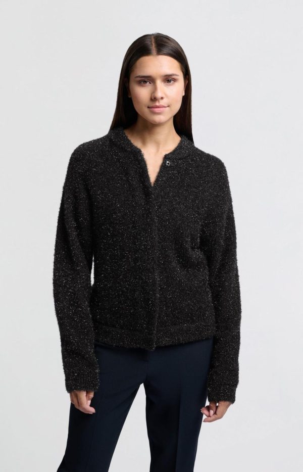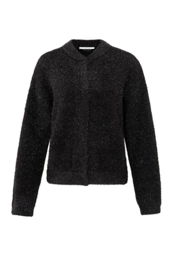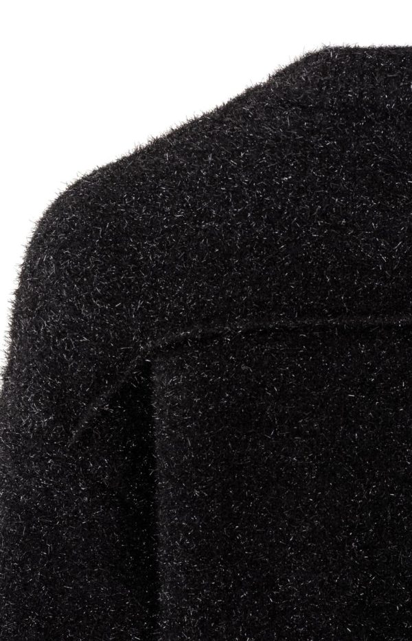 Dit zwarte fluffy bombervest heeft een subtiele glitter en is ontworpen met lange mouwen en een ronde hals. Het vest heeft een zachte textuur en een losvallende pasvorm, ideaal voor een casual en toch stijlvolle look. Perfect te combineren met jeans of een rok voor een veelzijdige outfit met een vleugje glamour. Het model is 174 cm en draagt maat S.