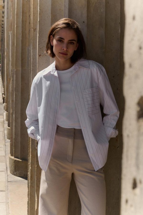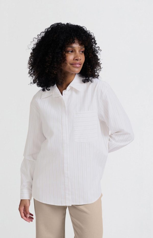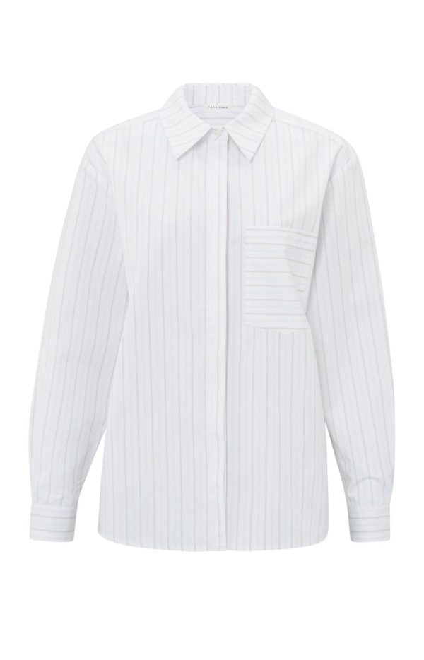 Deze stijlvolle blouse is gemaakt van een lichte stof met een subtiel gestreept patroon. Ontworpen met een klassieke kraag, lange mouwen en een borstzak voor een casual touch. De manchetten zijn afgewerkt met contrasterende strepen voor een verfijnde en moderne uitstraling. Perfect te combineren met jeans of een nette broek voor een veelzijdige en tijdloze look. Het model is 173cm en draagt maat 36.