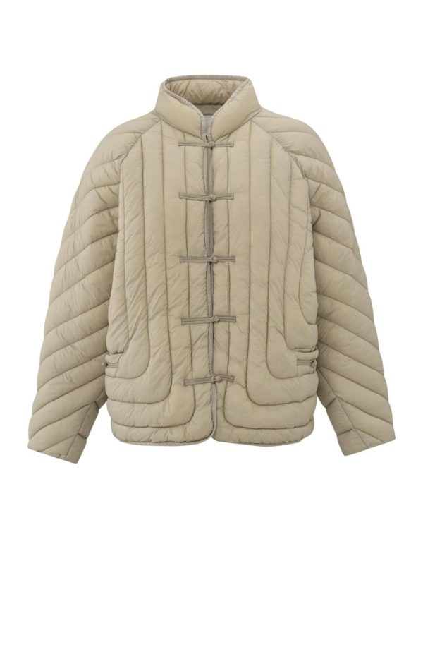 Deze lichte kimono jas is gemaakt van gewatteerd nylon en heeft een oversized pasvorm. Het ontwerp valt op door de gewatteerde banen, subtiele knoopsluitingen en een opstaande kraag voor een moderne uitstraling. Ideaal om over je outfit te dragen tijdens frisse dagen. Combineer het met een casual broek voor een stijlvolle, comfortabele look. Het model is 173cm en draagt maat 1.