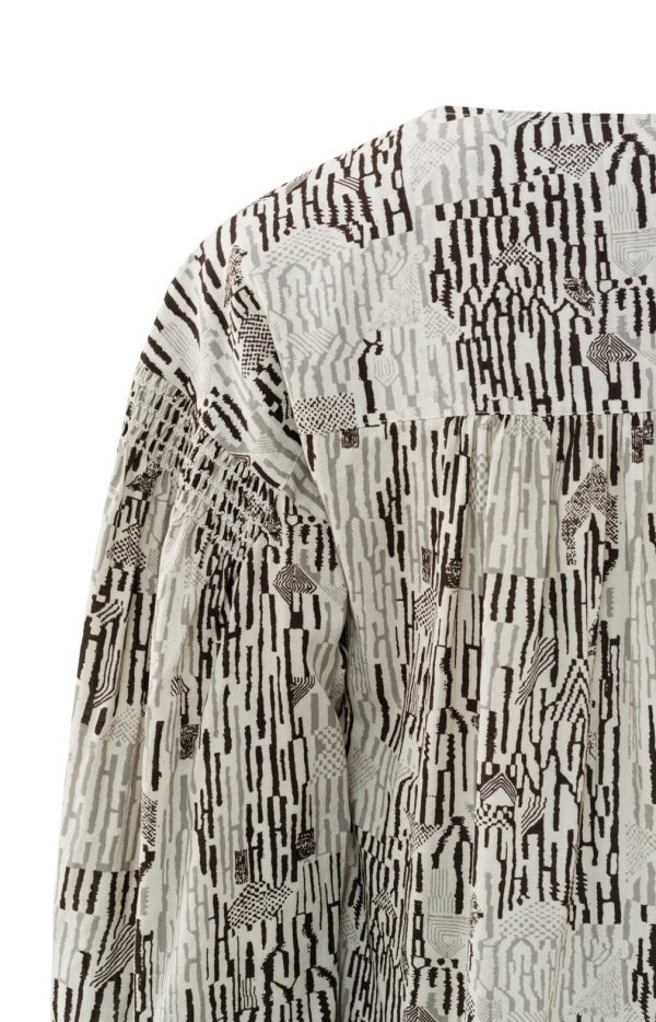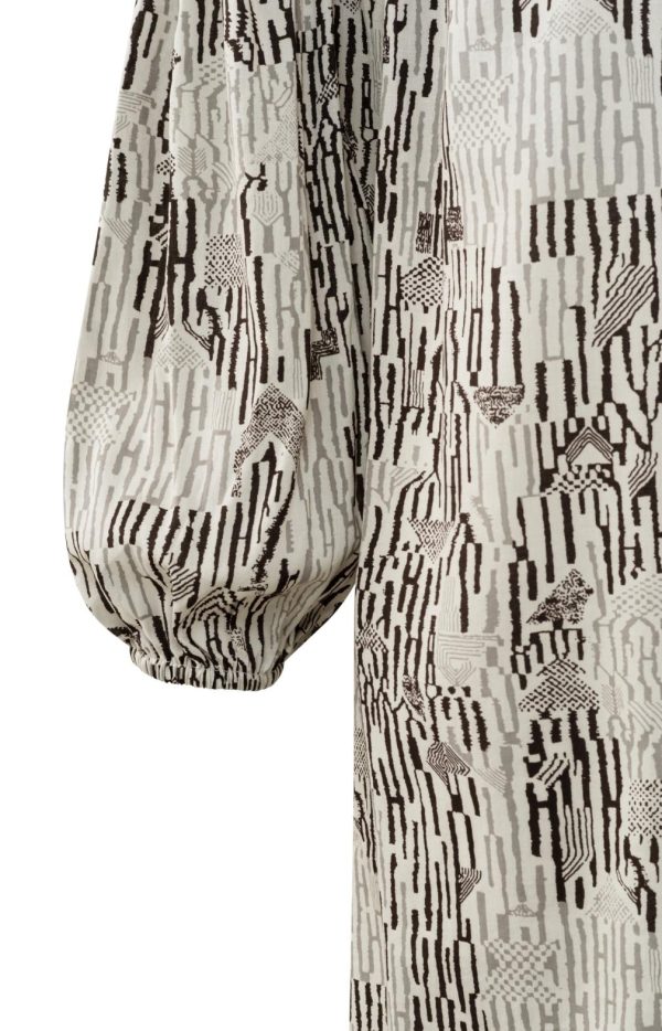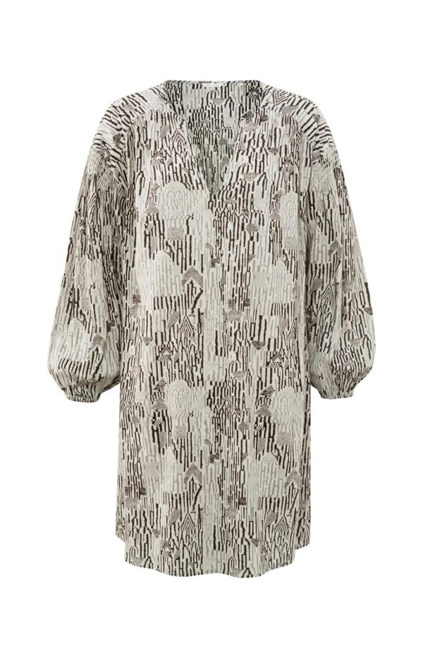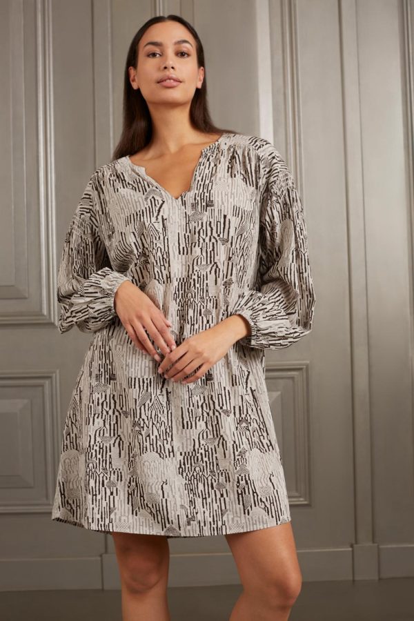 Een elegante kaftan jurk die is gemaakt van een verfijnde blend met katoen en viscose. De jurk heeft een V-hals, lange mouwen en is afgewerkt met een grafische print in donkere kleuren die zorgen voor een chique touch. Het model is 177cm en draagt een maat 36.